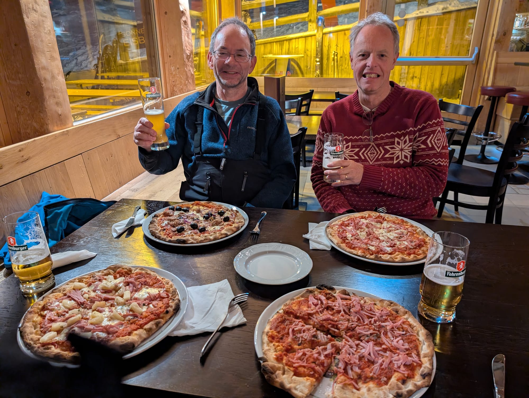 Based of last night's food timing debacle, we decided to have an earlier tea, not wanting to risk another emergency tea. We headed up to Taps, another Apres hot spot, and this offered a limited menu of Pizzas and Nachos until 6pm. This suited, and after some allergy back-and-forth, we had 4 pizzas and 4 pints in front of us. These were gobbled over tales of the day's piste adventures!