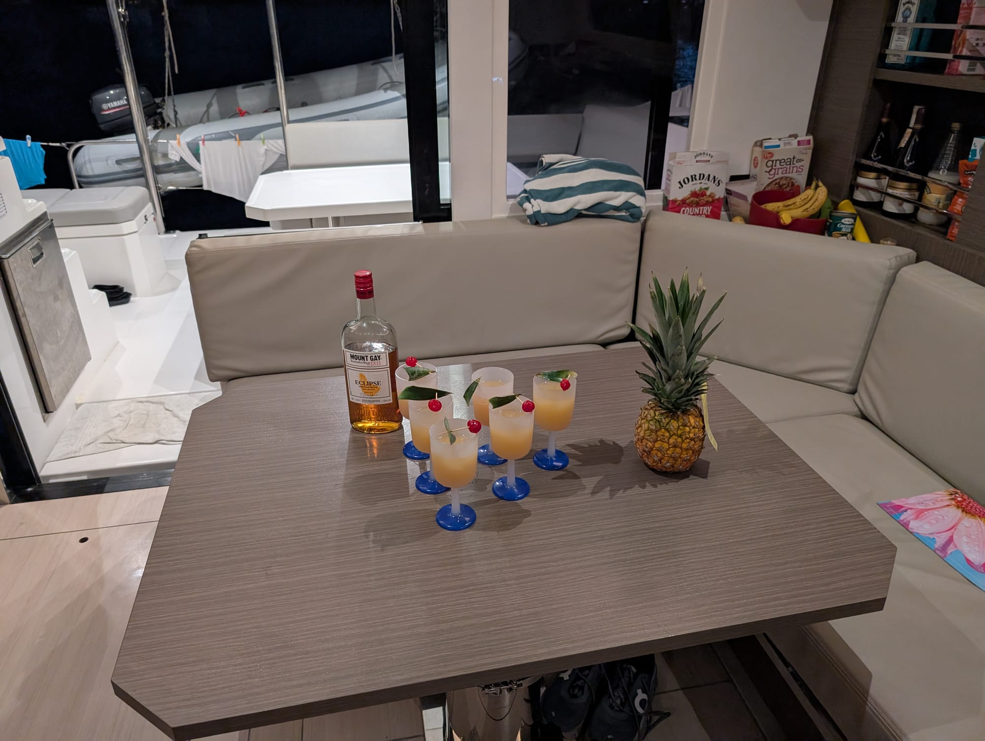 Then, it was back to the boat to have a supper of deconstructed Greek salad to account for various dietary preferences, and enjoyed a rum punch, complete with Pineapple leaf and Maraschino Cherry!